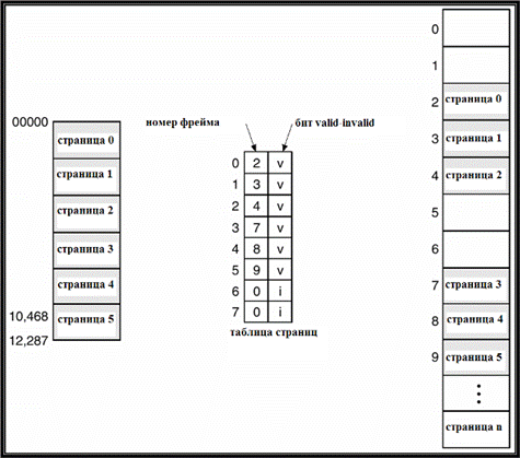 В примере процесс имеет 6 логических страниц с номерами от 0 до 5. Таблица страниц имеет длину 8 (с элементами от 0 до 7). Элементы 6 и 7 не соответствуют логическим страницам процесса, поэтому в них биты valid-invalid установлены в значение invalid. Поэтому при попытке обращения по логическому адресу с номером страницы 6 или 7 произойдет прерывание по неверной адресации.