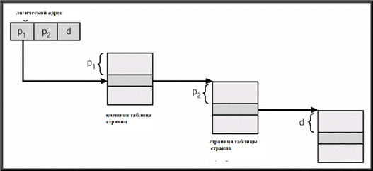 При двухуровневой организациии таблицы страниц, таблица страниц верхнего уровня сама делится на страницы, поэтому логический адрес будет иметь вид: (p1, p2, d), где p1 – индекс во внешней таблице страниц, p2 – смещение внутри страницы для внешней таблицы страниц, d – смещение внутри страницы (адресуемой по внутренней таблице страниц). При тех же предположениях об архитектуре и размере страницы, p1 и p2 будут занимать по 10 битов.