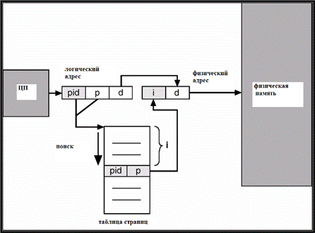 Данный способ организации таблиц страниц предназначен для сокращения размеров таблиц страниц. В таблице страниц хранится один элемент для каждой реальной страницы, находящейся в памяти. К логическому адресу добавляется номер процесса (pid) владеющего данной страницей. По паре (номер процесса = pid, номер страницы = p) выполняется ассоциативный поиск в таблице страниц. Индекс найденного элемента таблицы i конкатенируется со смещением d внутри страницы, в результате получается физический адрес. Инвертированные таблицы страниц иллюстрируются рис. 16.12.