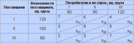Обычно начальные условия транспортной задачи записывают в так называемую транспортную таблицу (см. таблицу 2.3). В ячейках таблицы в левом верхнем углу записывают показатели затрат (расходы по доставке единицы продукта между соответствующими пунктами), под диагональю каждой ячейки размещается величина поставки xij (т.е. xij - количество единиц груза, которое будет перевезено от i-го поставщика j-му потребителю).