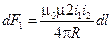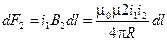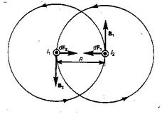 | Применим закон Ампера для определения силы взаимодействия двух бесконечных прямолинейных параллельных токов и . Каждый из проводников создает магнитное поле, которое действует по закону Ампера на другой проводник с током. Найдем силу, с которой магнитное поле тока действует на элемент второго проводника с током . |
