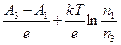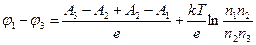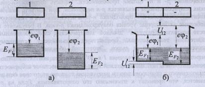 Металл 1 заряжен положительно, металл 2 – отрицательно. Возникает контактная разность потенциалов. Переход электронов будет происходить до тех пор пока работа по перемещению электрона за счет контактной разности потенциалов не станет равной разности работ выхода.