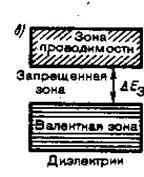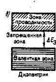 3б). Возможно также такое перераспределение электронов между зонами, возникающими из уровней различных атомов, которое привело к тому, что вместо двух частично заполненных зон кристалла окажется одна целиком заполненная (валентная) зона и одна свободная зона (зона проводимости). Твердые тела, у которых энергетический спектр электронных состояний состоит только из валентной зоны и зоны проводимости, являются диэлектриками или полупроводниками в зависимости от ширины запрещенной зоны. Если ширина запрещенной зоны кристалла порядка нескольких электрон –вольт, то тепловое движение не может перебросить электроны из валентной зоны в зону проводимости и кристалл является диэлектриком, оставаясь им при всех реальных температурах.