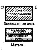 Различие между металлами и диэлектриками с точки зрения зонной теории состоит в том, что при 0 К в зоне проводимости металлов имеются электроны, а в зоне проводимости диэлектриков они отсутствуют. Различие же между диэлектриками и полупроводниками определяется шириной запрещенных зон: для диэлектриков она довольно широка (например для NaCl