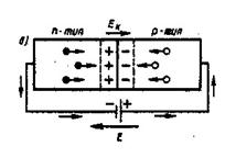 . Область соприкосновения таких полупроводников называется электронно-дырочным переходом (p – n переходом). При контакте лишние валентные электроны полупроводника n – типа перемещаются и заполняют свободные акцепторные уровни полупроводника p – типа. В результате в месте контакта образуется двойной электрический слой, обедненный носителями тока, который препятствует дальнейшему встречному движению электронов и дырок. Этот слой обладает повышенным сопротивлением, так как его толщина в 10000 раз больше контактного слоя проводников и в нем нет носителей тока. В зависимости от полярности приложенного к полупроводникам напряжения толщина этого слоя сильно меняется, что приводит к сильному изменению сопротивления.