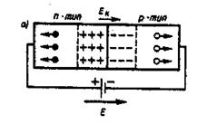 | Если приложенное к p – n переходу внешнее электрическое поле направлено противоположно полю контактного слоя, то оно вызовет движение электронов и дырок к границе p – n перехода навстречу друг другу. В этой области они рекомбинируют, толщина контактного слоя и его сопротивление уменьшаются. Следовательно, в этом направлении ток проходит через p – n переход (рис.6). Оно называется прямым. |
