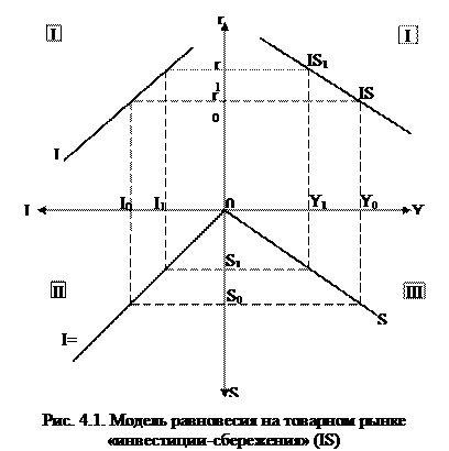 Основным параметром товарного рынка является реальный объем национального производства. Кривая IS («инвестиции-сбережения») описывает равновесие на товарном рынке и отражает взаимоотношения между рыночной ставкой процента r и уровнем дохода Y. Кривая IS выводится из простой кейнсианской модели, но отличается тем, что часть совокупных расходов и, прежде всего, инвестиционные расходы теперь зависят от ставки процента.