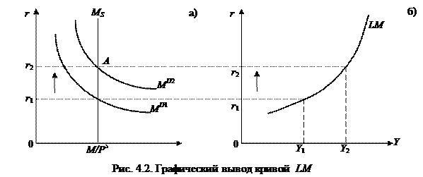 Пересечение кривой спроса с кривой предложения денег дает ставку r1, которая уравновешивает рынок денег при данном уровни дохода Y1 (рис. 4.2.б) Если доход увеличивается до уровня Y2, то кривая спроса на деньги сдвигается вправо (вверх)(рис.2. а), более высокому уровню доходов соответствует более высокая равновесная ставка процента r2 . Совокупность всех пар (Yr), которые уравновешивают рынок денег, дает кривуюLM (рис. 4.2. б).