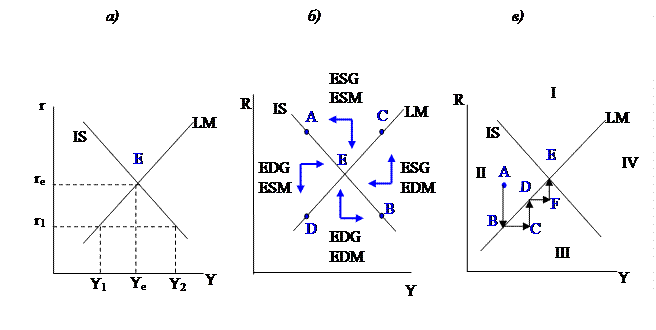 Если рынок товаров и услуг находится в неравновесии, то происходит непредвиденное изменение запасов, и фирмы либо сокращают, либо увеличивают объем производства, двигая экономику в точку Е. Таким образом, экономика будет двигаться как бы по лестнице (по ступенькам), пока не попадет в точку одновременного равновесия товарного и денежного рынков - точку пересечения кривых IS и LM.
