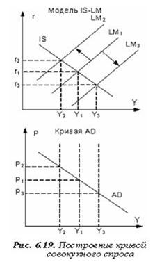 На основе анализа взаимодействия рынка товаров с рынком денег можно проследить, как изменение уровня цен влияет на величину совокупного спроса на товары, и построить его функцию, характеризующую зависимость объема спроса от уровня цен, т.е. кривую АD. На рис. 6.19 представлен графический вывод кривой AD из модели IS-LM.