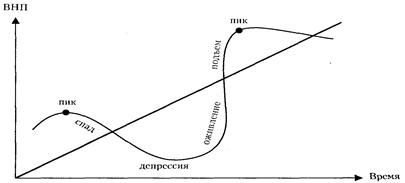 Все циклы имеют общие фазы: пик, спад (рецессия), депрессия (низшая точка спада), фаза подъема или оживление (экспансия) - (рис. 10.1).