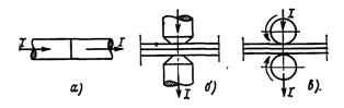 Рис. 1. Основные разновидности контактной сварки: а - стыковая, 6 - точечная, в - роликовая, I - направление сварочного тока.