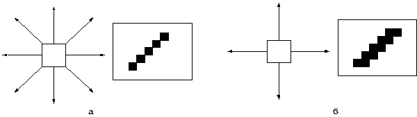 2) Результат – четырехсвязная линия. Соседние пиксели линии могут находится в одном из четырех возможных (см. рис. 5б) положениях. Недостаток – избыточно толстая линия при угле 45°.