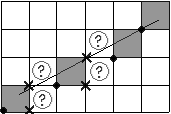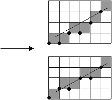Поскольку экран растрового дисплея с электронно-лучевой трубкой (ЭЛТ) можно рассматривать как матрицу дискретных элементов (пикселов), каждый из которых может быть подсвечен, нельзя непосредственно провести отрезок из одной точки в другую. Процесс определения пикселов, наилучшим образом аппроксимирующих заданный отрезок, называется разложением в растр. В сочетании с процессом построчной визуализации изображения он известен как преобразование растровой развертки. Для горизонтальных, вертикальных и наклоненных под углом 45°. отрезков выбор растровых элементов очевиден. При любой другой ориентации выбрать нужные пикселы труднее, что показано на рис.1.