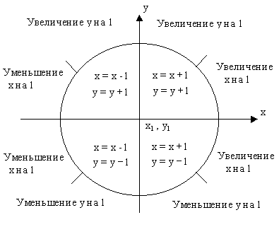 так как диагональный пиксел (xi, + 1, у i - 1) всегда лежит внутри окружности, а горизонтальный (xi, + 1, у i) - вне ее. Таким образом, можно вычислить по формуле