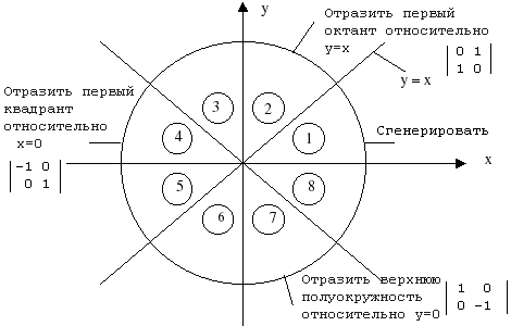 Рис. 5.1. Генерация полной окружности из дуги в первом октанте.