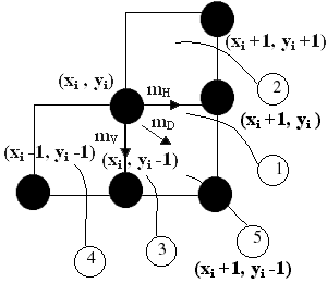 Легко разработать простые рекуррентные соотношения для реализации пошагового алгоритма. Сначала рассмотрим горизонтальный шаг mH к пикселу (xi + 1, уi). Обозначим это новое положение пиксела как (i + 1). Тогда координаты нового пиксела и значение i равны