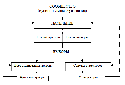 Организация социально-экономического развития сообщества как корпорации с экономической точки зрения, определяет следующую принципиальную схему управления: «население — акционеры — совет — менеджмент», которая является зеркальным отражением системы: «население — избиратели — представительная власть — администрация», реализуемой в сфере политического управления.