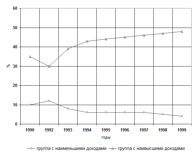 Наиболее полное представление о распределении денежных доходов населения дает распределение этих доходов по первой (с наименьшими доходами) и последней (с наибольшими доходами) 20%-ими квинтельным группам населения. В течение 90-х годов у 80% населения страны доля в общем объеме денежных доходов снижается, а в группе населения с наибольшими доходами наблюдается рост. Иначе говоря, бедные с каждым годом становятся беднее, а богатые – богаче. Такая негативная картина наблюдается в течение всего периода реформ. Это наглядно представлено на рис. 5[96].