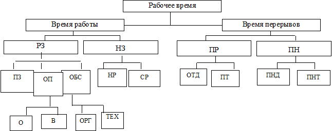 1) Время работы – время в течение, которого рабочий производит действия, направленные на осуществление трудового процесса. Подразделяется: