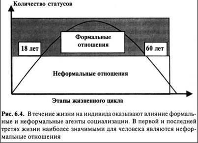 Неформальные институты, также как и формальные, действуют на протяжении всей жизни человека. Однако воздействие неформальных агентов и неформальных отношений достигает максимума в начале и в конце человеческой жизни, а действие формально-деловых отношений с наибольшей силой проявляется в середине жизни.