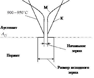 Поскольку граница между составляющими перлита (ферритом и цементитом) очень распространена, то превращение начинаются с образования большого количества малых зерен. Размер этих зерен характеризует величину начального зерна аустенита (рис. 9).