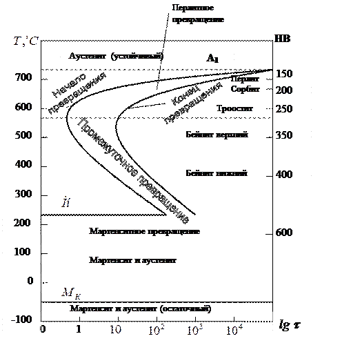 Устойчивость переохлажденного аустенита характеризуется инкубационным периодом, т. е. отрезком времени (от оси координат до линии начала превращения), в течение которого обычные методы не фиксируют появление продуктов распада.