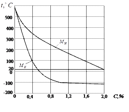 Мартенситное превращение происходит в некотором температурном диапазоне. Существуют температуры начала (Мн) и конца (Мк) мартенситного превращения, которые снижаются при повышении содержания углерода (рис. 12). Вследствие этого в сталях с содержанием углерода > 0,5% мартенситное превращение не завершается при комнатной температуре и часть аустенита не распадается. Этот аустенит называется остаточным и его количество увеличивается с повышением в стали углерода.