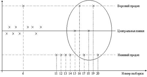 - расположение группы последовательных точек около одной контрольной границы, но не выход за нее (11, 12, 13, 14), что свидетельствует о нарушении уровня настройки оборудования;