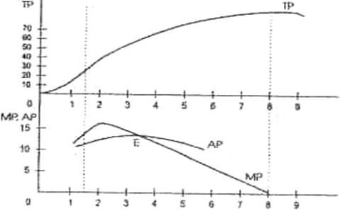 Средний и предельный продукт также характеризуются определенной зависимостью. Пока предельный продукт превышает средний, последний возрастает. Если же предельный продукт меньше среднего, то последний падает. Точка Е пересечения этих двух кривых определяет максимальное значение среднего продукта.