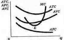 Предельные издержки связаны с действием закона убывающей отдачи. Если предположить, что каждая единица переменного фактора приобретается по фиксированной цене, то МС на производство каждой дополнительной единицы продукции будут падать до тех пор, пока предельная производительность каждой дополнительной единицы переменного ресурса будет возрастать. Падение предельной производительности вызовет рост предельных издержек. На графике в точке Е, где предельные издержки минимальны, предельная производительность достигнет своего максимального значения.
