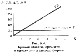 Поскольку фирма может продавать дополнительные единицы продукции по постоянной цене, кривая ее предельного дохода (MR) в условиях чистой конкуренции совпадает с кривой совершенно эластичного спроса (D). Кривая же валового дохода фирмы (ТR) имеет вид прямой восходящей линии, так как этот показатель увеличивается на постоянную величину с каждой дополнительной единицей продаж.