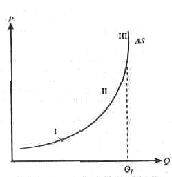 На кривой AS можно выделить три участка: I — горизонтальный (кейнсианский), II — промежуточный и III — вертикальный (классический) Горизонтальный участок назван кейнсианским по имени известного английского экономиста Кейнса. На этом отрезке реальный объем производства значительно ниже объема производства при полной занятости Qf. что свидетельствует о состоянии экономического спада, недоиспользовании производственных мощностей и избытке рабочей силы.