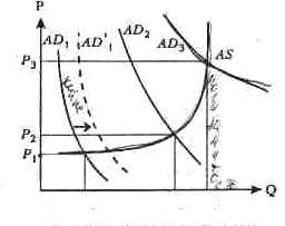 1 - Горизонтальный (кейнсианский) отрезок характеризуется высоким уровнем безработицы, большим количеством неиспользованных мощностей. Здесь равновесие совокупного спроса AD1 и совокупного предложения AS наступает при равновесном уровне цен Р1, и равновесном объеме производства Q1. Если бы был произведен больший объем производства, чем Q1, то он не нашел бы спроса и предприятиям пришлось бы сократить производство до Q1. При уровне производства меньше равновесного запасы фирм сократились бы и они стали бы наращивать производство до Q1. Увеличение спроса на этом участке до AD1' приведет к увеличению реального объема национального производства без изменения уровня цен.