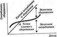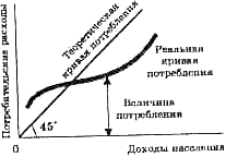 На графике функция потребления показана в виде теоретической линии, проходящей через начало координат. Это значит, что если доход равен нулю, то и потребление равно нулю. Если на потребление тратится весь доход, то график представляет собой прямую линию под углом в 45" к осям координат. Поскольку функция потребления на графике отражена в виде прямой линии, то уровень потребления всегда пропорционален величине доходов. Величина потребления здесь определяется расстоянием от оси X до реальной кривой потребления.