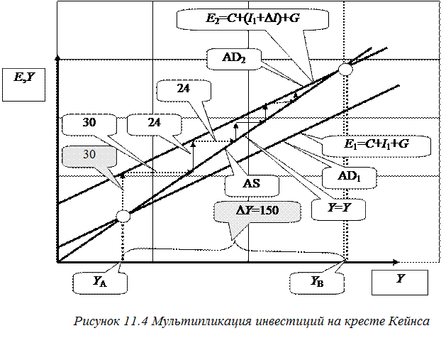 Рассмотрим процесс мультипликации инвестиций на кресте Кейнса (рис. 11.4).