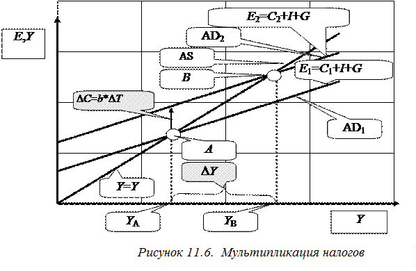 Сумма в 24 млрд руб. и начинает мультиплицировать (рис. 11.6). Поэтому общий прирост объемов национального производства Y будет меньше, чем в двух предыдущих случаях.