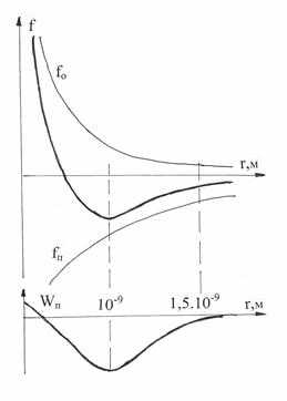 График зависимости сил притяжения и отталкивания от расстояния между молекулами представлен на рисунке 21, где результирующая кривая показана жирной линией. На результирующем графике можно видеть потенциальную яму, соответствующую расстоянию между молекулами. Это подтверждает, что силы взаимодействия между молекулами удерживают их на расстоянии, соизмеримом с размерами самих молекул.