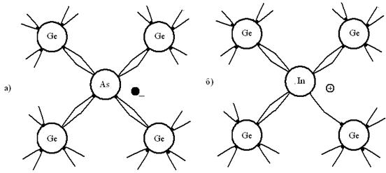 Примесь может увеличить во много раз либо число свободных электронов, либо дырок. В первом случае (рис.44(а)) примесь выполняет роль донора (отдает электроны) – проводимость n – типа, а во втором (рис.44(б)) – роль акцептора (отбирает электроны) – проводимость р – типа.