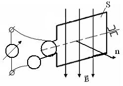 Пусть проводник выполнен в виде рамки, которая имеет площадь S и может вращаться вокруг оси перпендикулярной однородному магнитному полю (В=Const). Контур пронизывается магнитным потоком (рис.57)