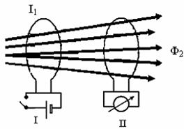 Взаимная индукция – это явление возникновения ЭДС в замкнутом контуре при изменении тока в соседнем контуре. Пусть в замкнутом контуре I существует переменный ток (рис. 58). Возникающее вокруг этого контура магнитное поле пронизывает соседний замкнутый контур. Так как магнитный поток, пронизывающий этот контур изменяется, то в нем будет возникать ЭДС, определяемая по формуле: