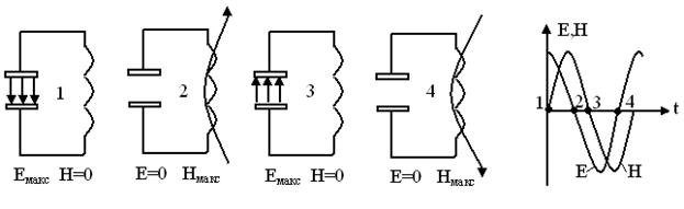 Когда конденсатор заряжен, вся энергия колебательного контура сосредоточена в виде электрического поля вокруг конденсатора. Напряженность магнитного поля на катушке в этот момент равна нулю. Заряженный конденсатор будет разряжаться через катушку. По виткам катушки пойдет электрический ток, сила которого изменяется. В результате этого, в витках катушки будет возникать ЭДС самоиндукции, При полной разрядки конденсатора, когда напряженность электрического поля вокруг него будет равна нулю, вся энергия колебательного контура будет сосредоточена вокруг катушки в виде магнитного поля. И напряженность магнитного поля вокруг катушки в этот момент будет максимальной. ЭДС самоиндукции, возникающая в витках катушки, породит ток, который перезарядит конденсатор, затем процесс повторится.