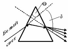 Пусть на призму падает пучок естественного света, каждая составляющая естественного света, в зависимости от длины волны преломляется под своим определенным углом. Красный преломляется под наименьшим углом. Чем меньше длина волны, тем больше угол отклонения.
