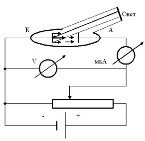 Схема дает возможность измерять силу фототока и скорость фотоэлектронов при различных значениях напряжения между катодом и анодом при различных условиях освещения катода.