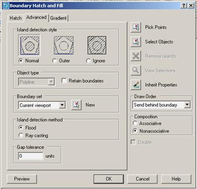 При выполнении штриховки можно выбирать не только образец, но и стиль штрихования – Advanced (Рисунок 2.8). В AutoCADe предусмотрены три стиля штрихования: Normal (Нормальный), Outer (Внешний) и Ignore (Игнорирующий). Стиль штрихования действует только в том случае, когда внутри области штрихования содержатся какие-то объекты (другие, вложенные контуры). По умолчанию устанавливается нормальный стиль штриховки.