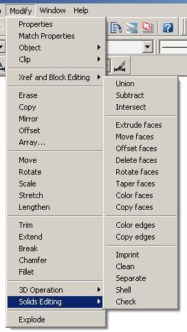 В AutoCAD имеются так же специальные команды редактирования трехмерных тел. Эти команды собраны в подменю Solids Editing главного меню Modify (Рисунок).