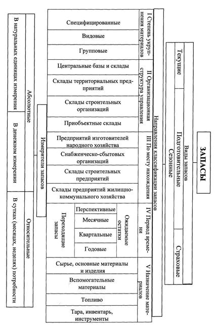 Таким образом, запасы представляют собой материальные ценности, не находящиеся в процессе производственного, общественного или личного потребления. Это материальные ценности, которые находятся на складах поставщиков в виде готовой продукции, на промежуточных складах, базах снабженческо-сбытовых организаций и на складах строительных предприятий.