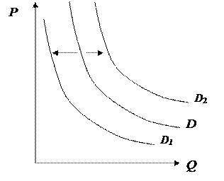 Например, увеличение денежных доходов потребителей (при отсутствии инфляции) означает повышение спроса, т. е. сдвиг кривой D в положение D2. При этом спрос может возрастать быстрее или медленнее роста дохода в зависимости от качества товара, его места в бюджете потребителя и ряда других свойств, которые будут выяснены позже. Такая ситуация типична для большинства товаров, за исключением низкокачественных. Рост доходов переключает потребителей на товары лучшего качества, спрос же на низкокачественные товары снижается, т. е. кривая перемещается из положения D в положение D1.