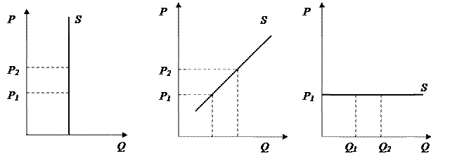 Полученная линия называется кривой предложения (S). Кривая предложения показывает, какое количество экономического блага готовы продать производители по разным ценам в данный момент времени. Имеет обычно положительный наклон и выпукла в сторону объема (линия спроса, как правило, выпукла к началу координат). Как частный случай, может использоваться линейный характер функций спроса и предложения (прямые линии). Если рассмотреть ситуацию, складывающуюся на рынке со стороны предложения, то легко заметить, что зависимость величины предложения от цены прямая: чем выше цена, тем больше товара (при прочих равных условиях) готовы предложить продавцы.