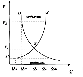 В противоположной ситуации рыночная цена устанавливается на уровне Р2, т. е. меньше Е, следовательно Q d2 > Q e, а Q s2 < Q e. Спрос больше предложения, т. е. на рынке установился дефицит товара.